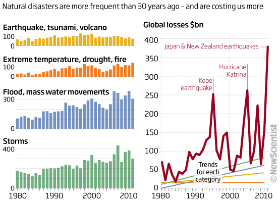 - Cost of natural disasters spiralled in 2011 (New Scientist, 2012-01-11).