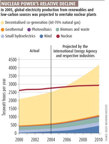 Though small, such projects are already flourishing. Much of the world's small-scale generation involves combined heat and power "co-generation" projects, whose carbon dioxide emissions are 30 to 80 per cent less than that of large-scale gas-fired plants. On average they are at least 50 per cent less. The worldwide uptake of this technology is being accompanied by fast growth in the use of renewables such as solar and wind. The Danish company Bonus, from which the Westmill co-operative wants to buy its wind turbines, now has a backlog of orders from wind farms in Texas, Florida, Sweden, Denmark, Germany and Greece. In 2005 the company, bought by Siemens, almost doubled its wind turbine sales, and its fabrication capacity for 2006 is fully booked. This burgeoning "micropower" movement is a significant step towards reducing carbon emissions (New Scientist, 21 January, p 36). It is also a knock for a nuclear industry that has been struggling to get back on its feet in the western world. Until last year, near-zero emissions of greenhouse gases were nuclear power's trump card, its big advantage over other sources of electricity and the one thing that might make western governments invest in a nuclear renaissance: nuclear is clean and produces a lot of power, so we need it. That argument now has a hole punched through it, and it boils down to economics. Until recently, it seemed the wide-scale construction of a new generation of nuclear power plants was inevitable. China is investing in nuclear, after all, as are Japan, Russia and India, so why not the west? Though Germany, Sweden, Spain and Switzerland have forsworn investment in new nuclear plants, other western nations, notably the UK, France and the US, are taking the idea seriously. In August 2005, the US government handed out a range of nuclear subsidies and incentives worth nearly $20 billion. In the UK, Prime Minister Tony Blair has commissioned an energy review with what is widely believed to have a pro-nuclear agenda, marking a move away from the position three years ago when his government said there was no case for nuclear new build. France, which already gets 78 per cent of its electricity from nuclear power, has its eye on starting construction of at least one more plant within the next decade. In the UK and the US, the case for a nuclear renaissance is on the table mainly because the reactors now generating electricity are coming to the end of their lives. The cry is going up that this will lead to an energy gap: in a few years there won't be enough electricity to go round, and the lights will go out. That's a simplistic analysis, of course. "The idea of a 'gap' is artificial and fails to acknowledge the dynamics of the market system," says Jim Watson, an energy analyst in the Science Policy Research Unit at the University of Sussex, UK. The energy markets in these countries will tend to ensure that there will always be electricity to buy and sell, Watson points out. The cost may go up and the sources may change, but the market will quickly adjust by using more electricity derived from coal and gas, for instance. Without nuclear, though, won't we be producing ever more carbon emissions? Not necessarily. Nuclear never was part of the short-term solution to climate change, and the rapid growth in small-scale energy production means nuclear may not be needed as part of the long-term solution either. Of the electricity added to the worldwide supply in 2004, micropower technologies generated almost three times as much as nuclear. Spain and Germany's ventures into wind power alone added as much power capacity in 2004 as the world's nuclear industry will add from 2000 to 2010. Industry projections indicate that by 2010, renewable and low-carbon sources will offer 177 times as much added capacity as nuclear. This is not going to be enough to power the world; large-scale fossil-fuel generators will still be needed in this timescale. But the overarching global trend is clear. Few new nuclear stations will be operating before 2020, and by the time these plants are even half-built, there will be enough low or no-carbon electricity available from non-nuclear sources to give investors in nuclear plants second thoughts. The 'negawatt' effectIf they ever invest at all, that is. In January, the financial analyst Standard & Poors issued a report saying that even the new incentives for the US nuclear industry will not be enough to persuade investors to climb aboard; from a business perspective, nuclear remains the highest-risk form of power generation. That's because the subsidies don't deal with the capital, operating and decommissioning risks that most concern the capital markets, says Amory Lovins, CEO of the Rocky Mountain Institute, a Colorado-based energy analysis firm. "The effect of even such huge subsidies will be the same as defibrillating a corpse," he says. "It will jump, but it will not revive." "" What's more, a report issued in February by the California-based Electric Power Research Institute (EPRI), whose members include private and public organisations concerned with power generation and distribution, says that implementing energy efficiency measures together with technologies that can respond to changes in demand offers a cost-effective alternative to adding new generating capacity. Contrary to what is often said, we are getting better at controlling our hunger for electricity. If you want proof, just ask the US firms who built gas-fuelled power plants capable of generating 200 gigawatts of electricity, and then found that the anticipated demand they were catering for never materialised. The investors lost $100 billion. According to Lovins, worldwide electrical savings, or "negawatts", now match or exceed global additions of low or no-carbon micropower. So far, the EPRI says, we have only scratched the surface of possible efficiency increases; it is estimated that the US could save three-quarters of the electricity it now uses. 