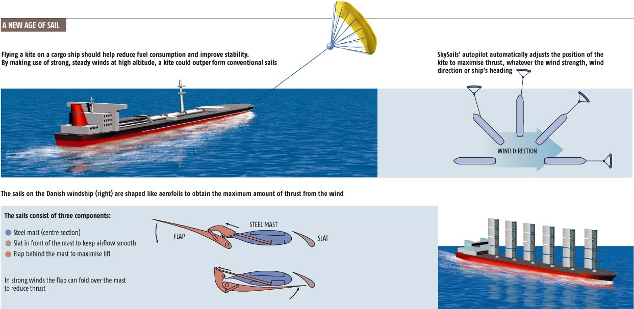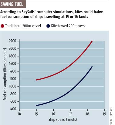 Wind-tunnel tests showed this design to be twice as efficient as the sails on a traditional windjammer. Even more importantly, the sail generates thrust when the ship is sailing close to the wind. Simulations suggest that the vessel will be able to make progress under sail even when the wind is blowing as little as 40 degrees off the bow, which is an excellent performance for a large sailing vessel. With a fresh breeze of 9 metres per second at 100 degrees - blowing only slightly from behind - the sails alone can propel the ship at 13 knots (25 kilometres per hour. Unlike traditional sails, these fibreglass wings will not need a large crew to operate them, the designers say. They can be controlled hydraulically from the bridge, and because they never need to be lowered there is no need for storage space that would eat into the cargo capacity. The downside is that in light winds, with the ship under diesel power, they exert aerodynamic drag - even with flaps retracted - which negates some of the fuel savings from having them there in the first place. The SkySails kite suffers no such handicap. The idea is to harness the winds higher above the ocean with an inflatable aerofoil - a kite designed to fly at a height of 100 to 500 metres, towing the ship on a cable fastened to the hull. At 500 metres, winds are often stronger and less variable than at sea level, and can differ in direction from those immediately above the waves by 10 to 15 degrees, according to Barry Gromett of the UK's Met Office in Exeter. "Although these differences are not huge they could be really useful," he says. SkySail's aerofoil is designed to maximise thrust whatever the wind conditions. It uses a computer autopilot and patented wind sensors coupled to the ship's steering system to calculate the kite's optimum position. Then the autopilot manoeuvres the kite using motors in a control unit suspended beneath it to change the trim of the aerofoil by adjusting the tension in its control lines. The kite can move along a rail around the hull to maximise its towing efficiency and a winch on the ship adjusts the length of the kite's main line to fly it where the wind speed and direction are most favourable